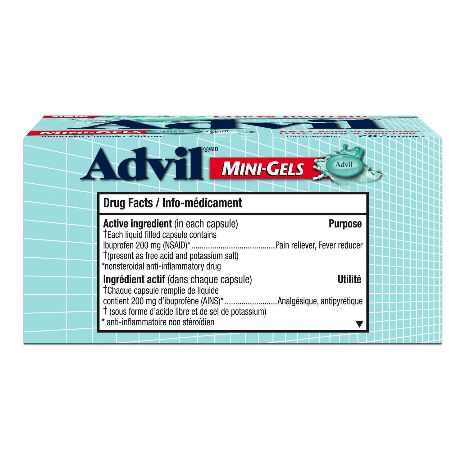 •Includes 1 bottle of Advil Mini-Gels (70 count) ibuprofen capsules •Fast and effective pain relief is now mini and easy to swallow!