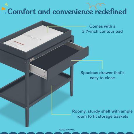 It’s time to make those stressful diaper-changing times pleasant and hassle-free. Introducing your multi-purpose nursery BFF that’s going to make your life easier - the Fisher-Price by Dream On Me Delani Changing Table. With a sturdy shelf that provides ample storage, keep your changing necessities within reach, and you'll be done in no time. Crafted with sustainable New Zealand Pinewood and solid wooden spindles, this versatile changing table is a durable choice. For your child’s complete safety, the Fisher-Price by Dream On Me Delani Changing Table meets/exceeds the ASTM & CPSC standards, and comes with an anti-tipping kit. This convenient changing table also comes with a 3.7” thick changing pad and a secure safety belt to keep your little one in place. Available in 2 versatile finishes - Carbon and White, this changing table is a must-have in your nursery. Product dimensions are 36 1/4"L x 18 7/8"W x 36" H, with a weight of 38 Lbs and a maximum weight limit of 30 Lbs. Draw size: Outer Dimensions are 32. 4“ L x 14.9“ W x 5“ H and Inner Dimensions are 30.3” L x 13.5” W x 2.7” H. This product can be used by children aged 0-6 months.